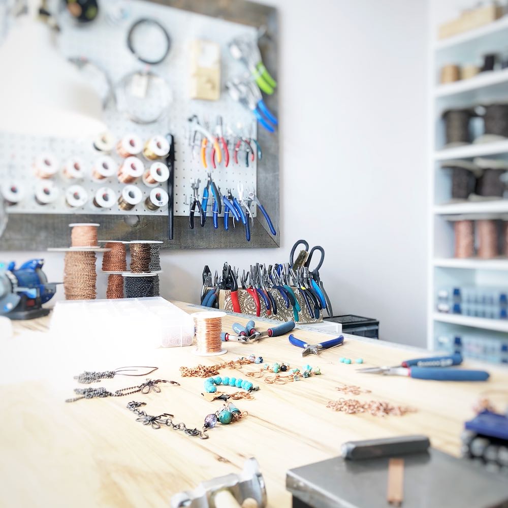 - Handmade parts: many parts we need we make ourselves from the same wire we already use. This reduces the need to buy hundreds of tiny individually packaged parts like ear wires, clasps, headpins, etc.