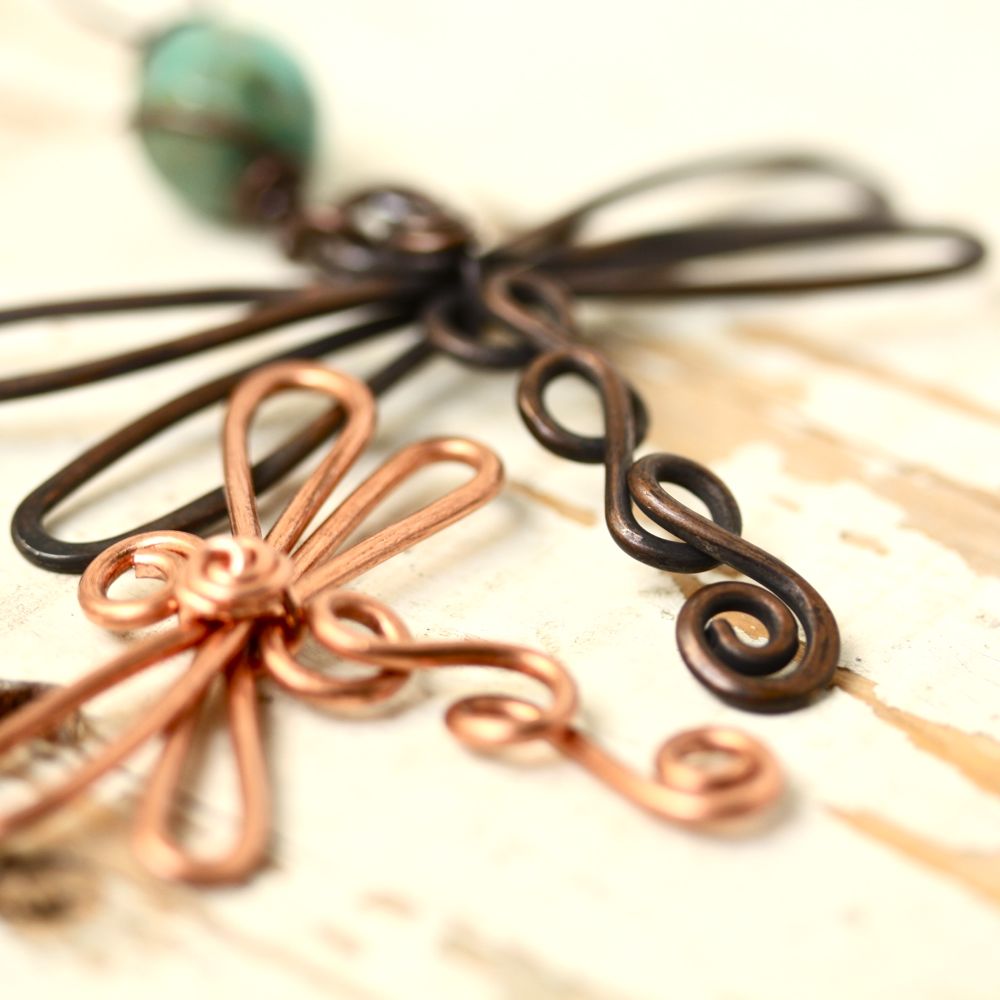 I use hand tools like pliers and various shapes of mandrels to bend, twist, and form the wire. Hammering the wire stiffens it and also shapes, flattens, or adds texture to the metal. Many pieces are oxidized, speeding up the natural patina forming process, to lend a boho casual vintage vibe. This look also forgoes the need for polishing since the patina is an intentional aspect of the design.