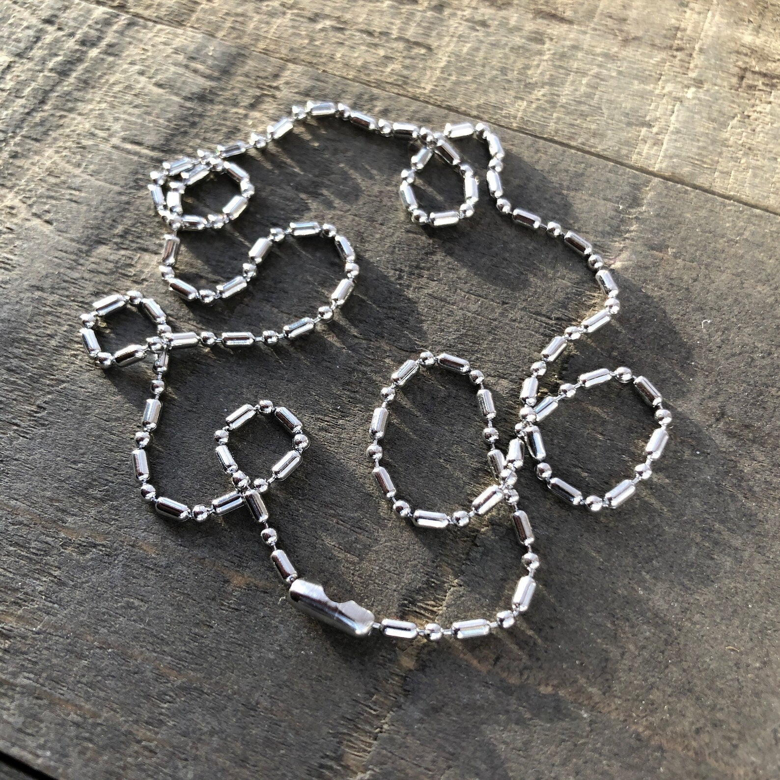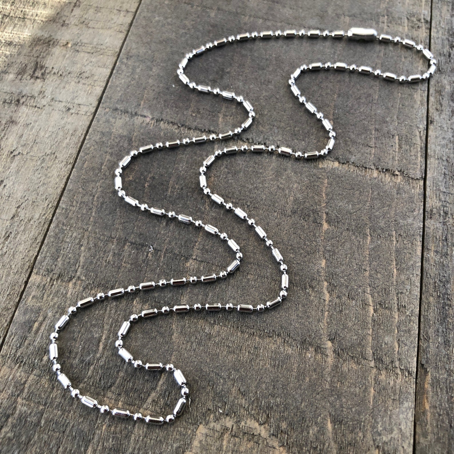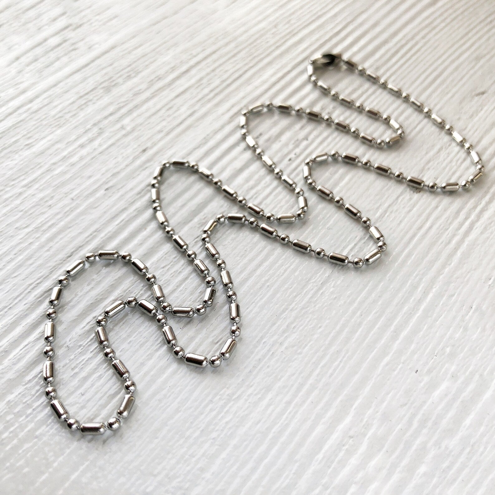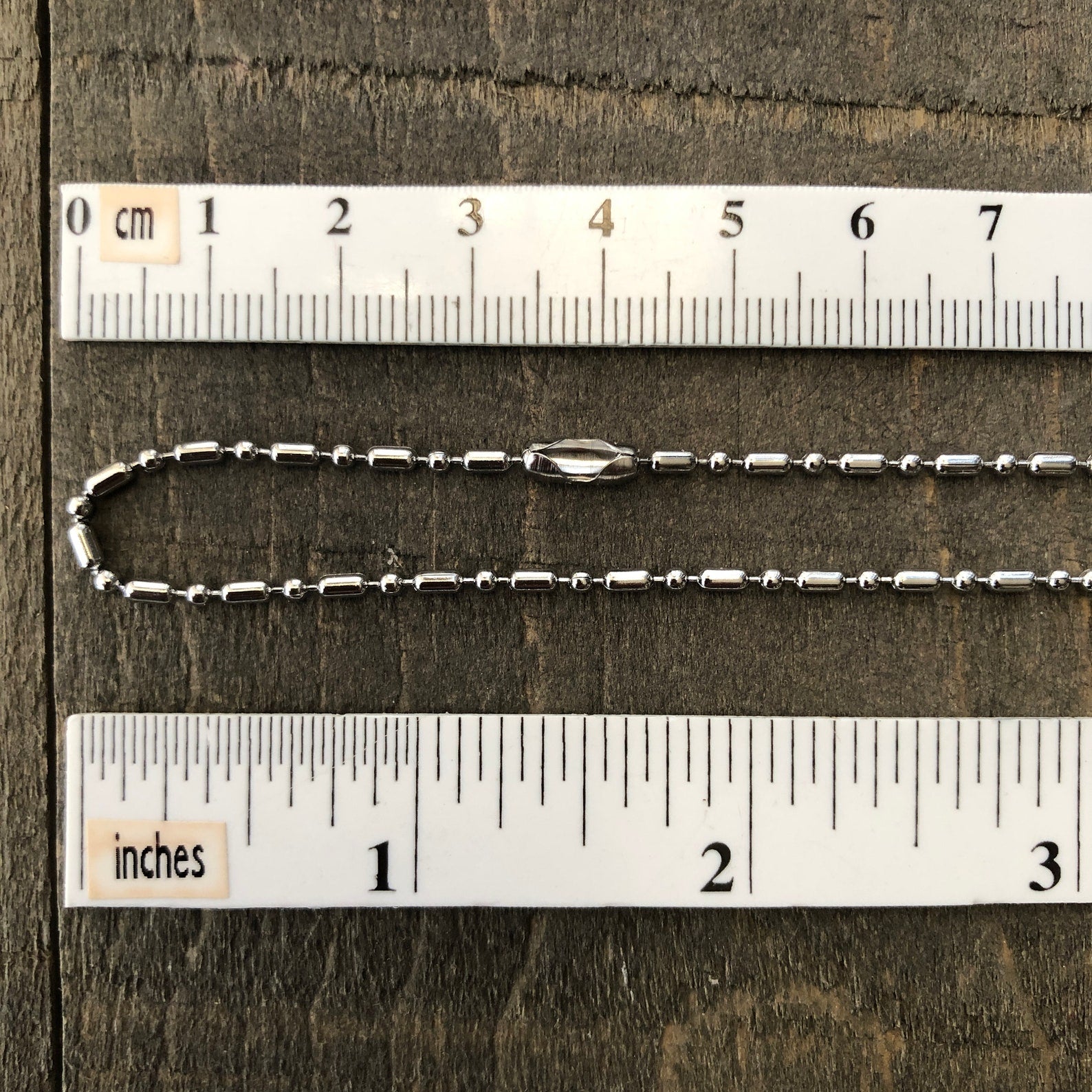 This 2mm stainless steel ball-bar chain features a sleek, polished finish and a low-profile end connector, making it a versatile choice for pendants or layered necklaces. Its alternating “ball” and “bar” links create a subtle pattern that adds visual interest while remaining lightweight and wearable.