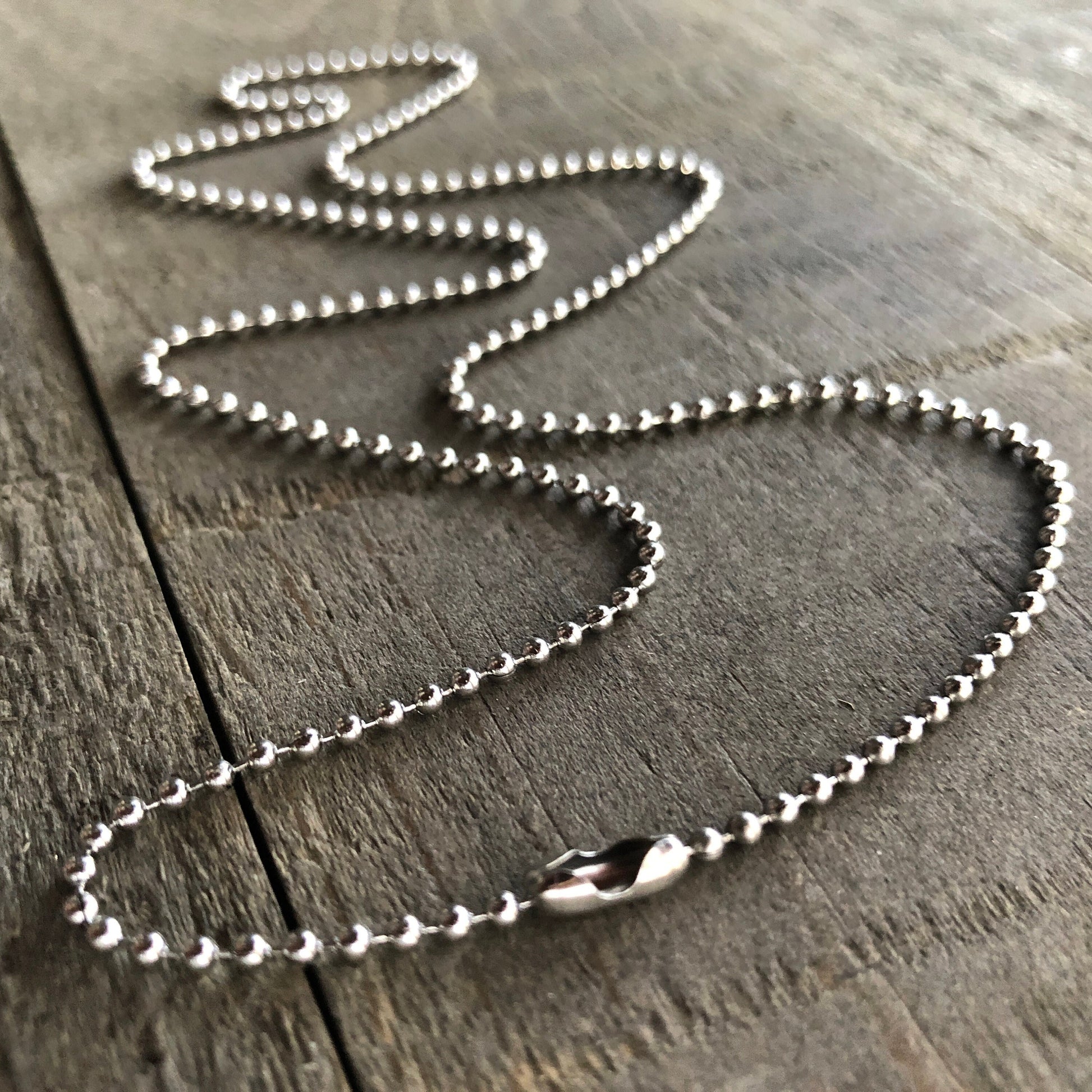 This 2mm stainless steel ballchain features a sleek, polished finish and a low-profile end connector, making it versatile for pendants or layered necklaces. A daintier take on the traditional dog tag chain, it is lightweight, wearable, and durable.