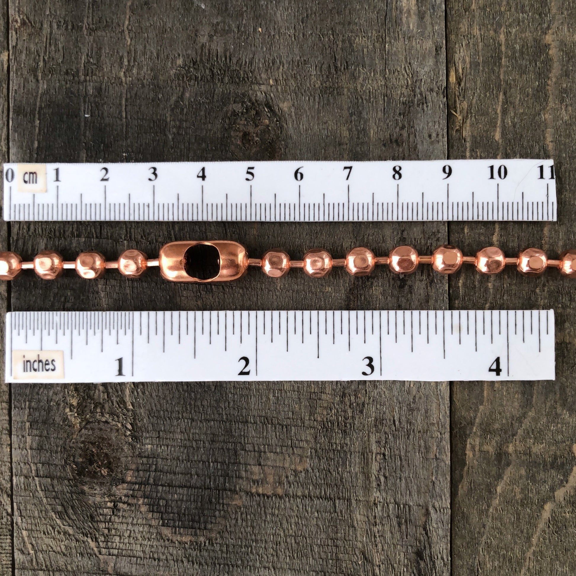 One extra-large 6mm solid copper ball chain necklace with end connector. This bold, faceted chain features flattened facets around each bead for a subtle textured pattern and a distinctive look. Perfect for men, statement pieces, or pendants. All parts are solid copper and left bare (not lacquered), naturally developing a darker patina over time.