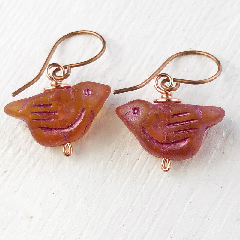 Orange Czech glass bird earrings. Wire-wrapped bird beads are matte orange with pink wash.