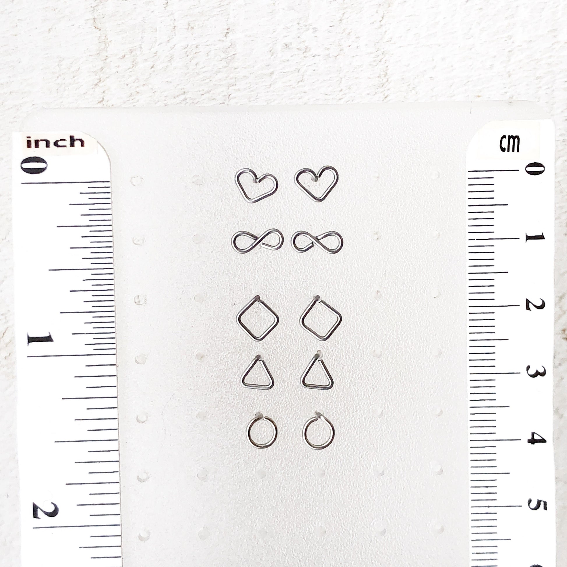 Tiny stainless steel studs. These are handmade, so expect slight variation from piece to piece. Stud ends are filed smooth for comfort. Comes with clear silicone stoppers.
