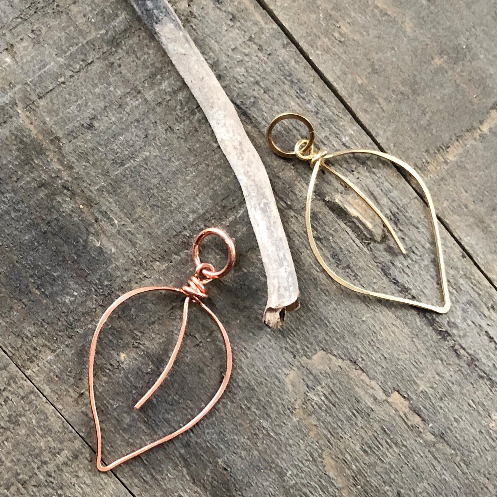 Copper Leaf Pendant, Artisan Wirework Leaf Necklace Charm, Hammered Copper or Gold Brass, Boho Nature Inspired
