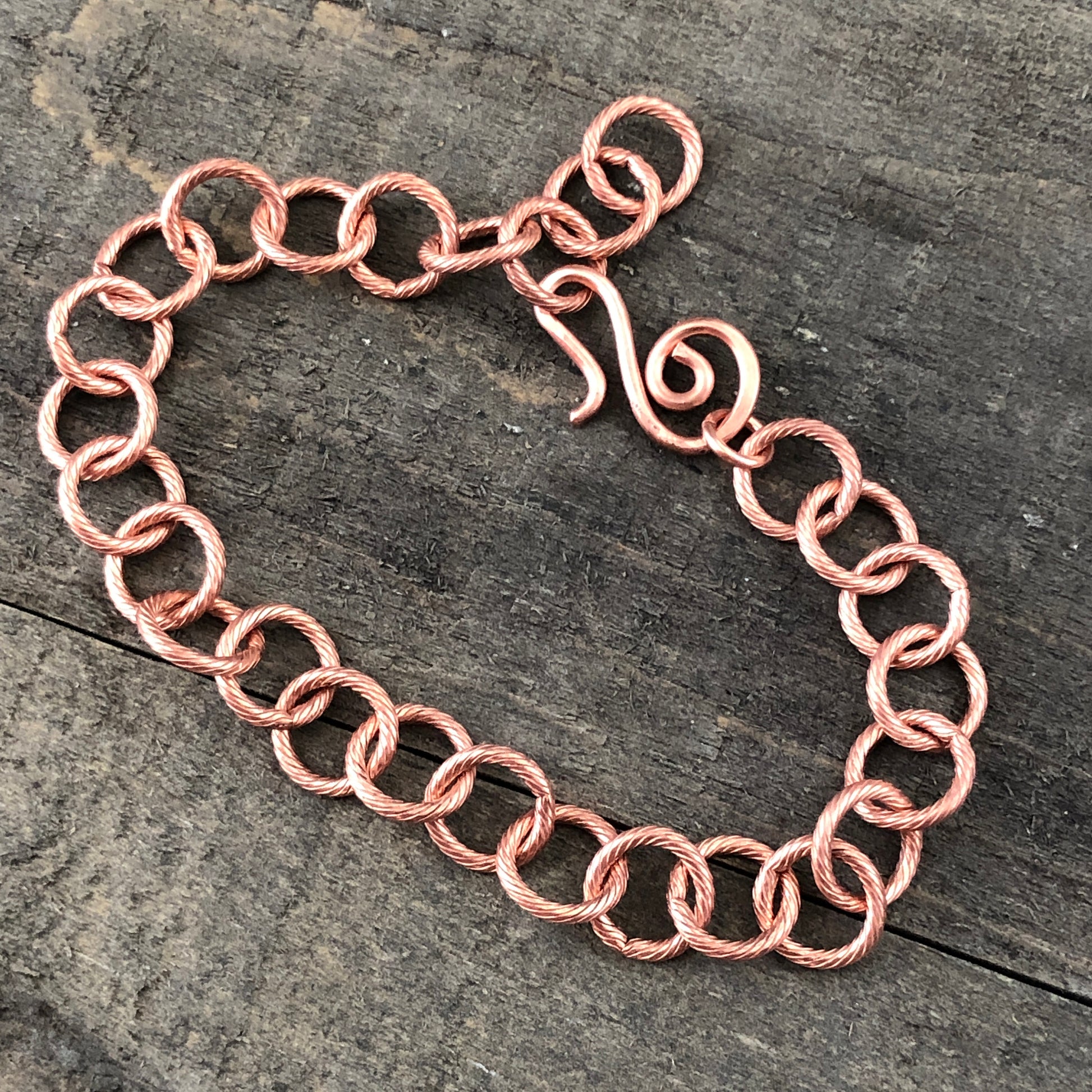 This copper bracelet or anklet is made with round cable links etched with a spiral line pattern for a touch of texture. The handmade artisan clasp can hook through any link, making the chain fully adjustable for a comfortable fit.