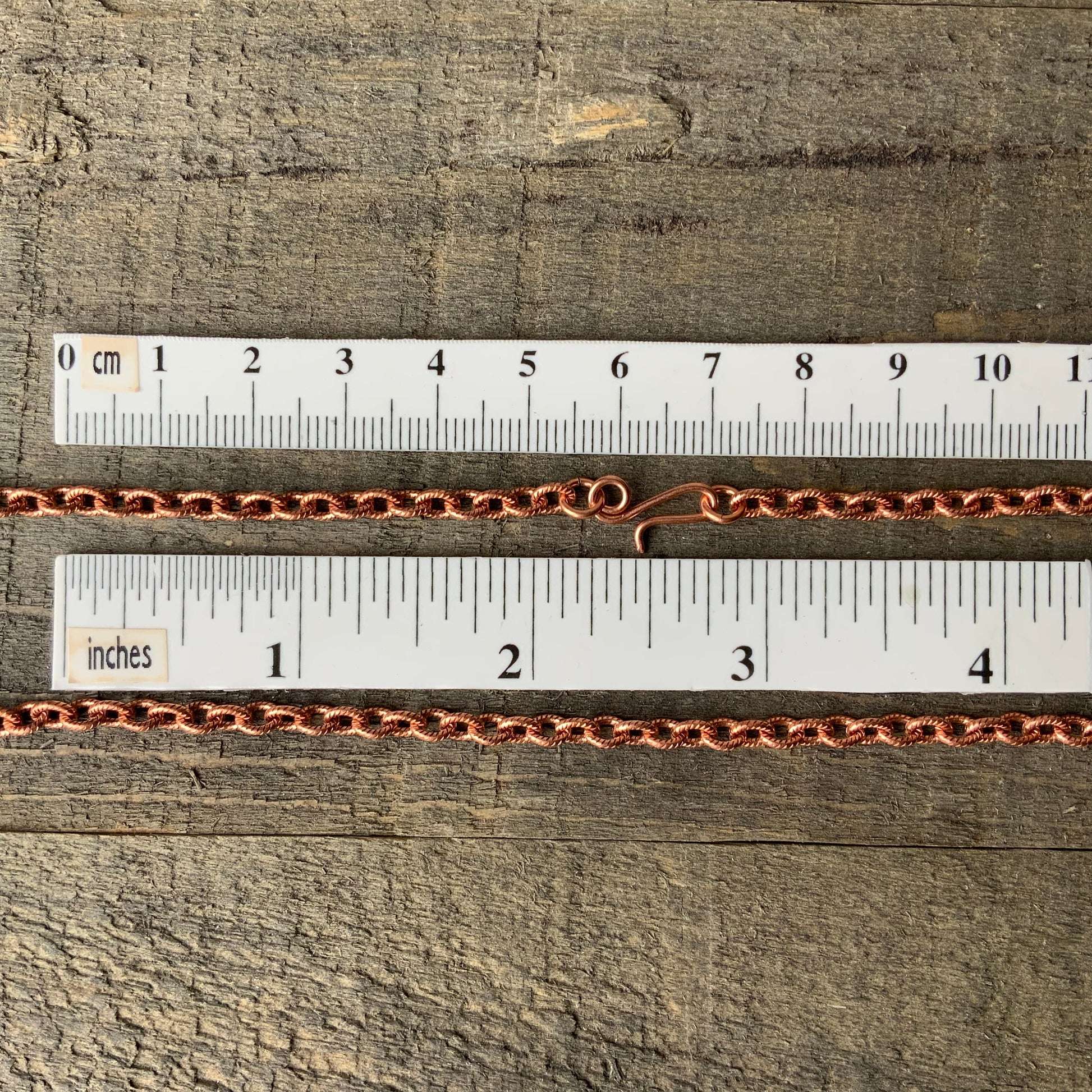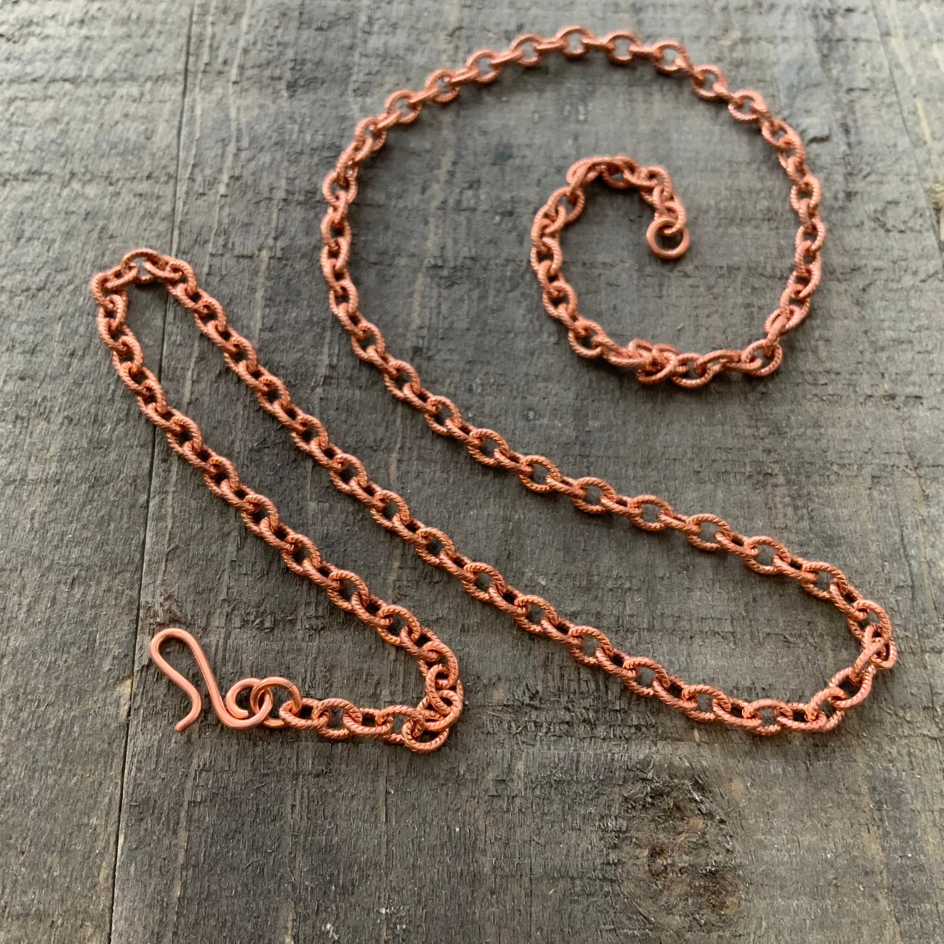 This genuine copper necklace chain features a subtle etched pattern on each link, creating a light texture of diagonal lines for a handcrafted, artisanal look. All parts of the chain are solid copper, including the handmade clasp that hooks securely through the end loop.