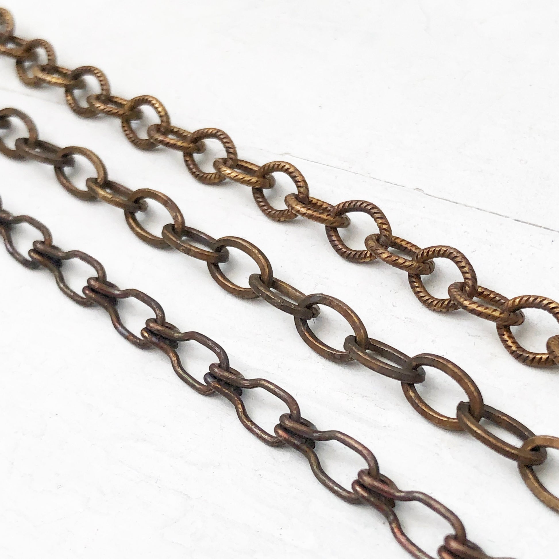 The brass is oxidized by hand and left bare (unlacquered), giving each chain its own unique finish. Color variations naturally occur during this process, ranging from bright golden tones to deep brown—even within the same length of chain.
