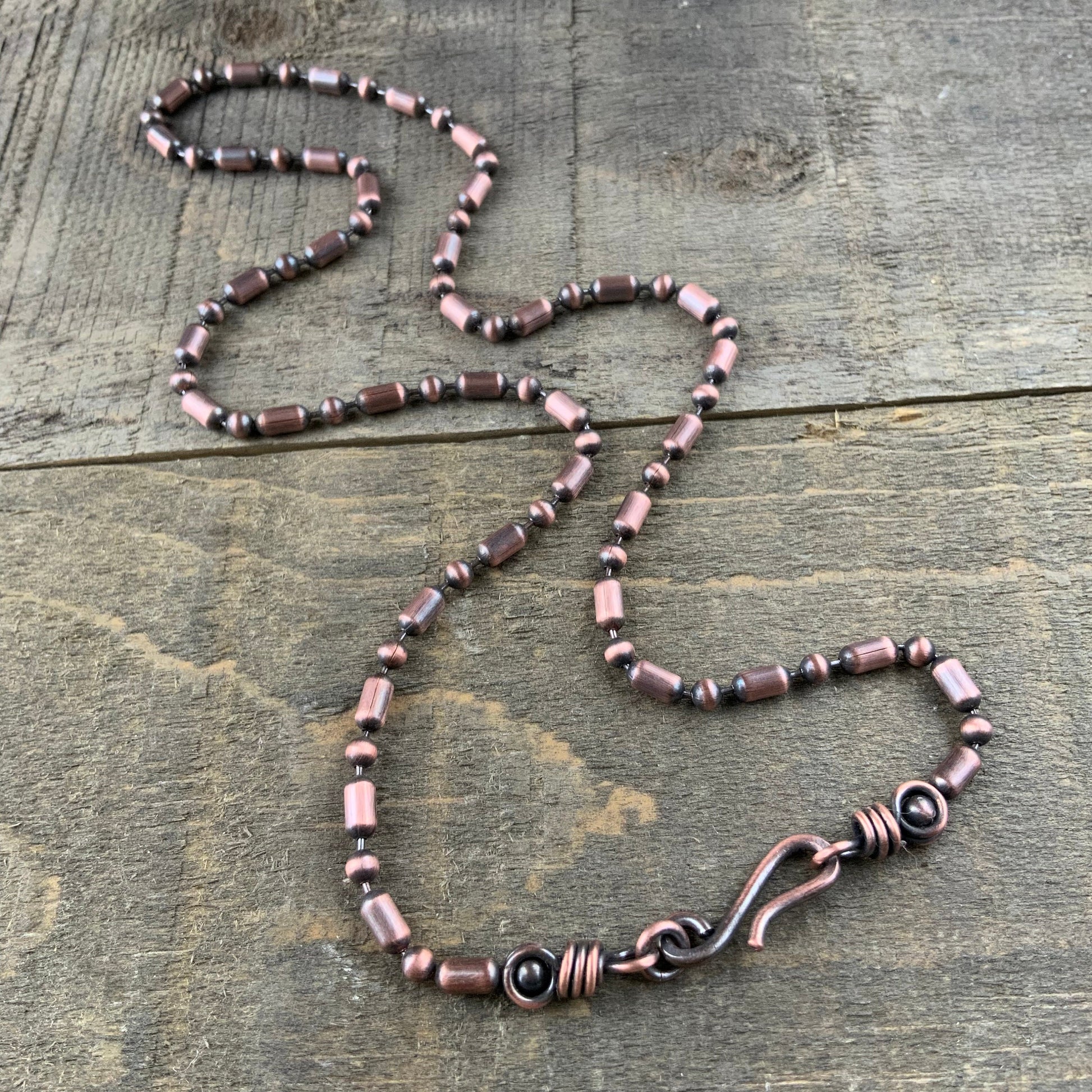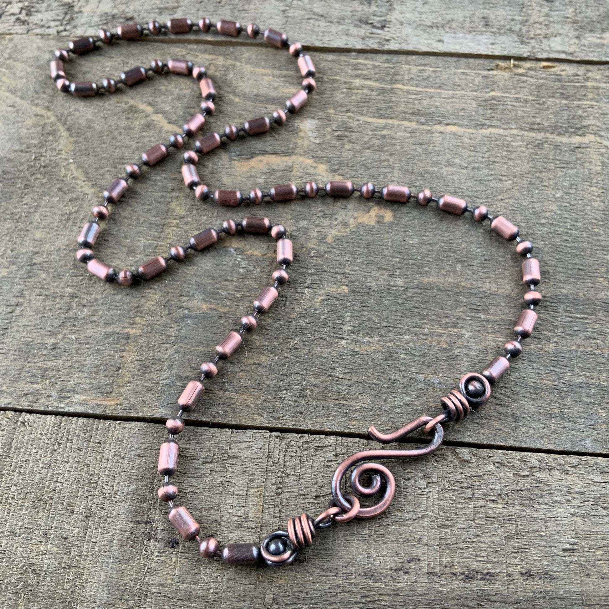 Handmade 3.2mm oxidized copper ball-bar chain necklace featuring a unique artisan clasp and hand-wrapped end loops. Each clasp is crafted to order from reclaimed solid copper wire, giving your necklace a one-of-a-kind artisan touch.