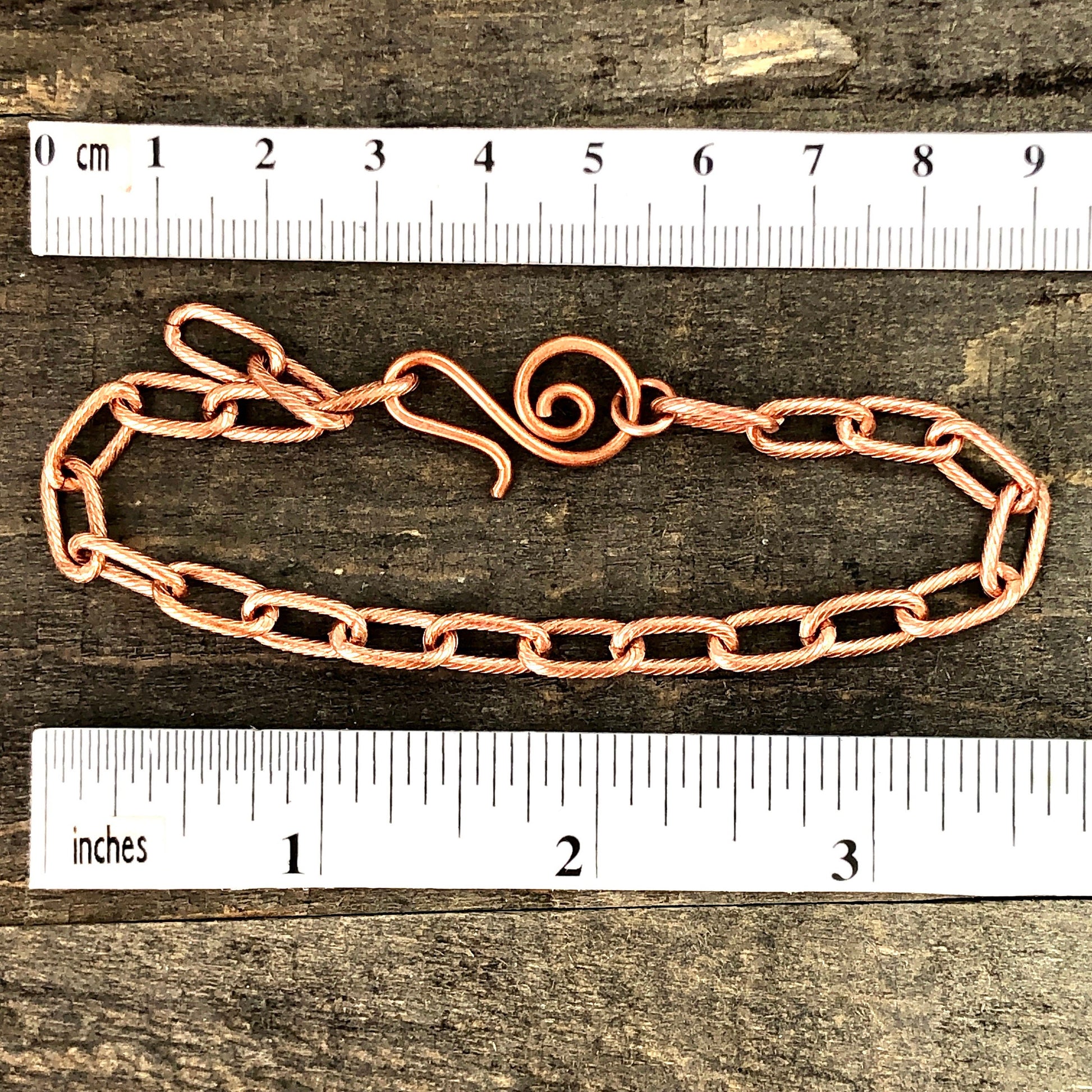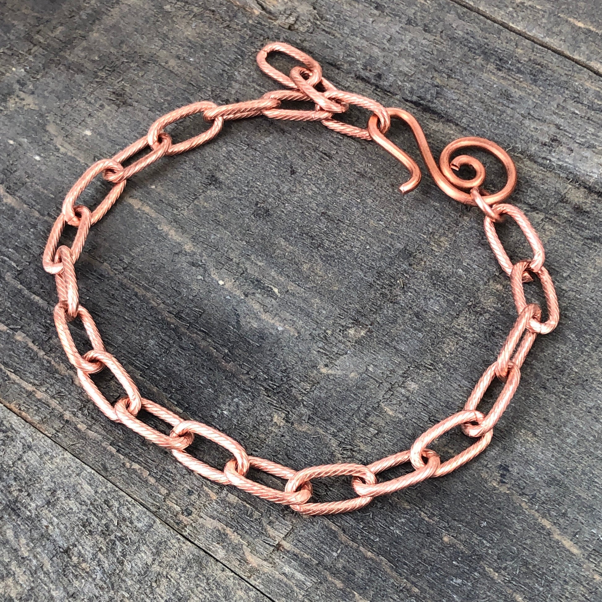 This adjustable copper bracelet (or anklet) is crafted with elongated paperclip-style oval links etched in a subtle spiral pattern. The handmade artisan clasp can hook through any link, allowing you to adjust the length for a perfect fit.