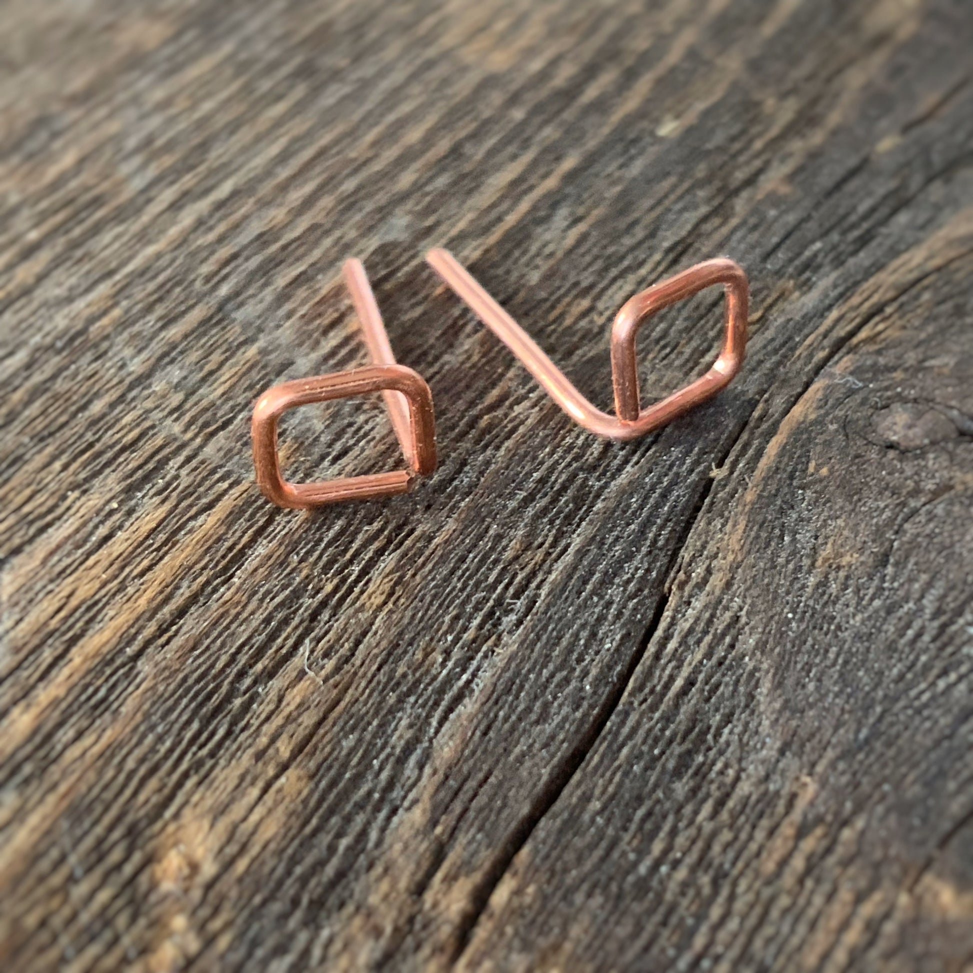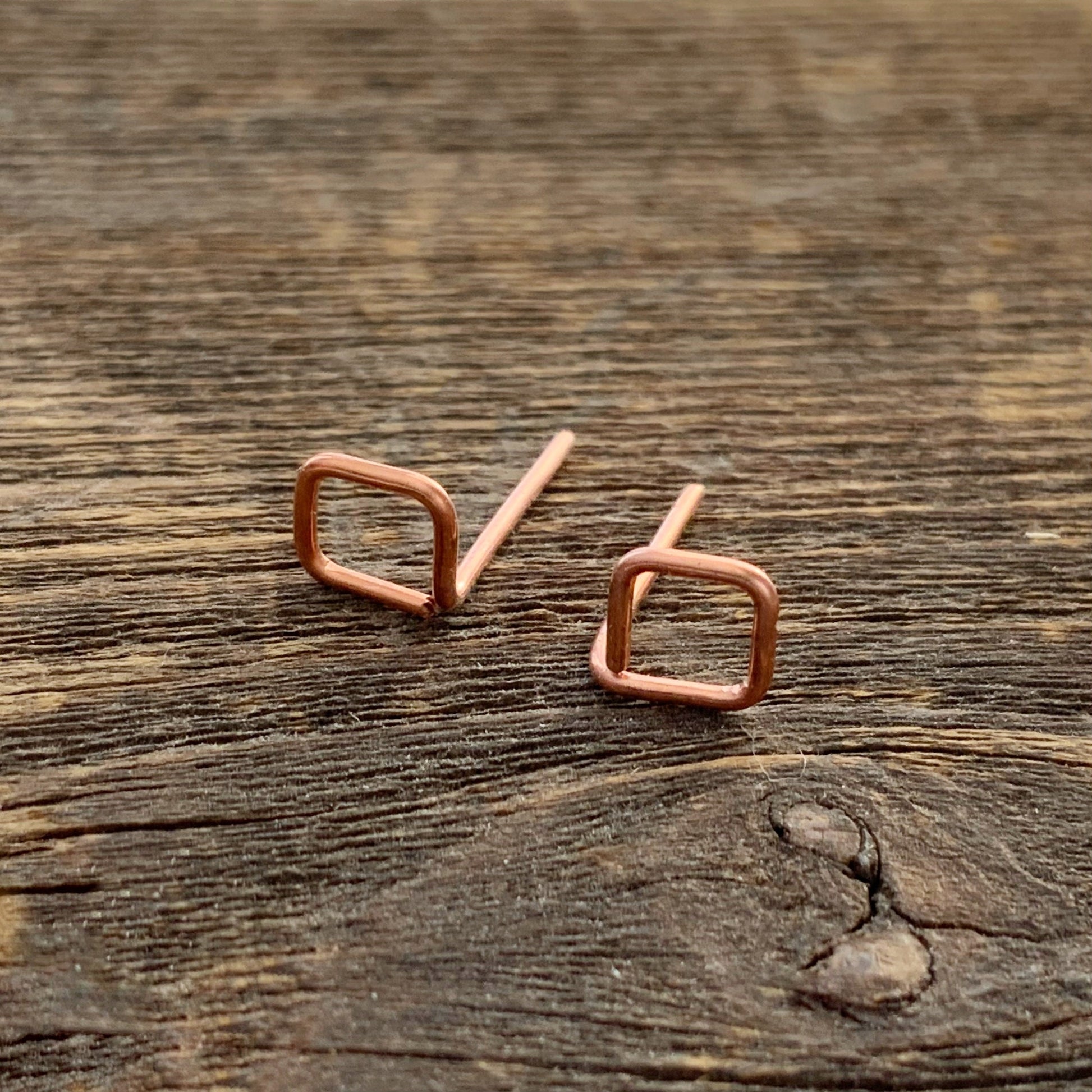 Tiny square genuine copper studs. These are handmade, so expect slight variation from piece to piece. Stud ends are filed smooth for comfort. Comes with clear silicone stoppers.