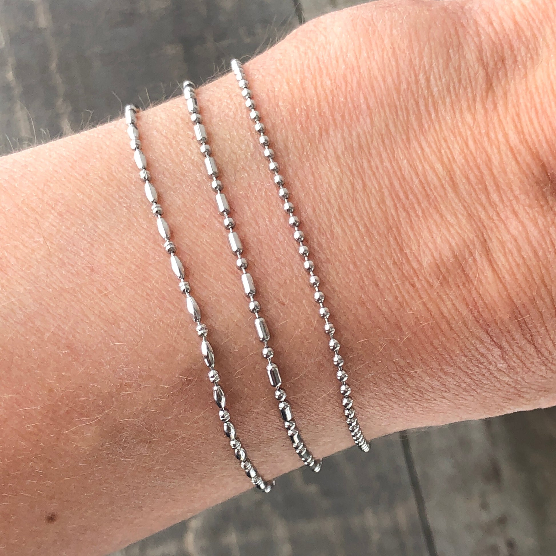 A delicate yet sturdy stainless steel ball chain bracelet or anklet, perfect for minimalist style or layering with charms. This skinny 1.5mm chain is lightweight, polished, and built to last.