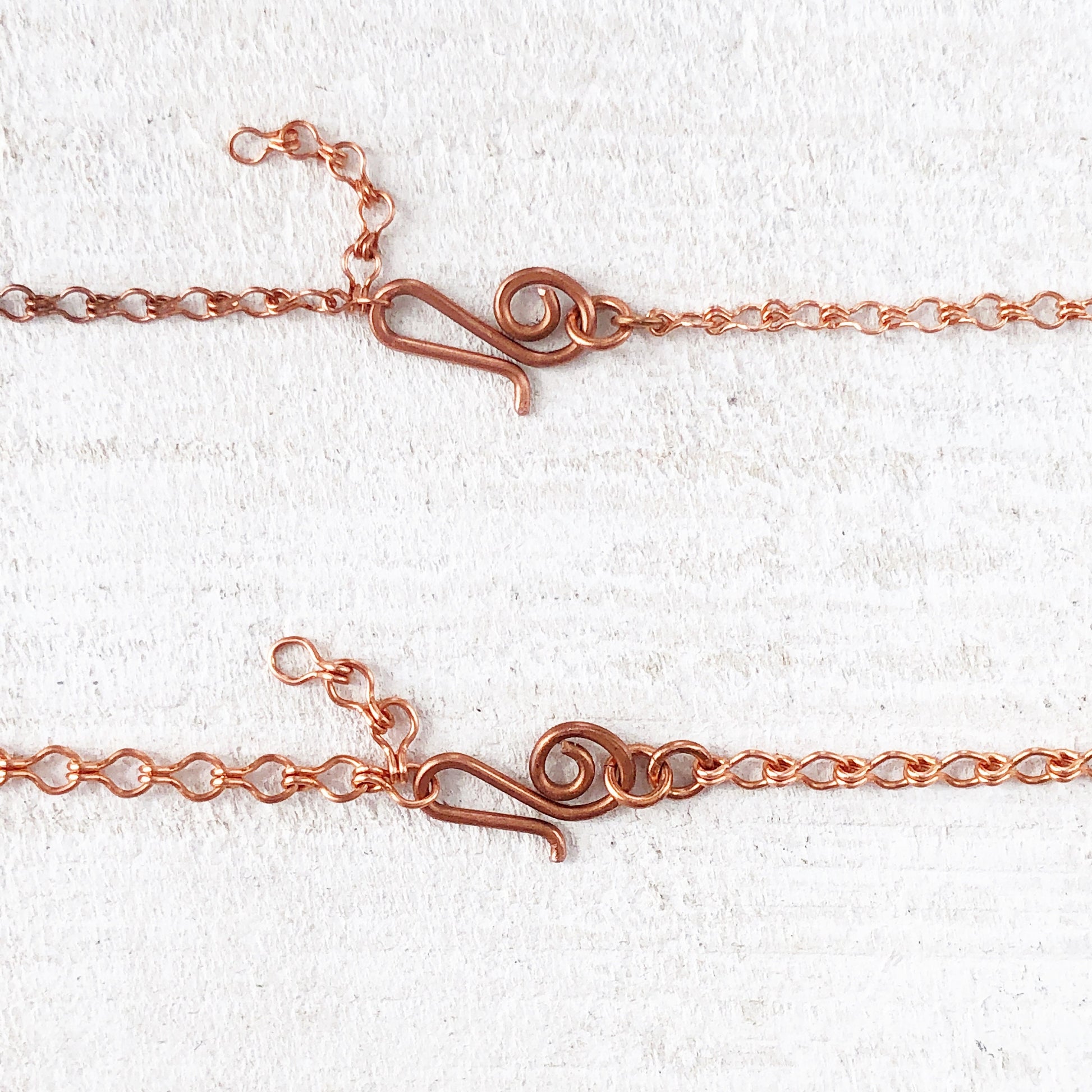 The handmade solid copper clasp hooks through any link to adjust the chain length.