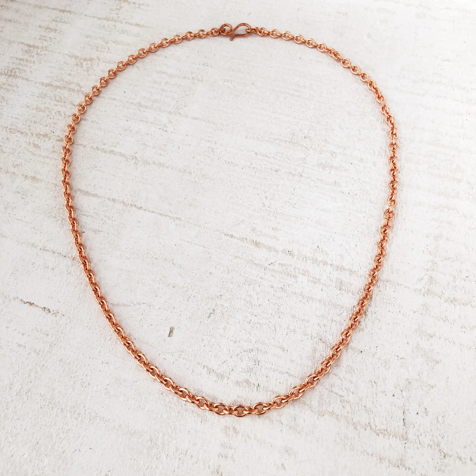 Handmade solid copper clasp hooks through the end loop of the chain. The end loop is 5.5 mm wide — if you plan to add a pendant, please check that your pendant bail fits over the chain.