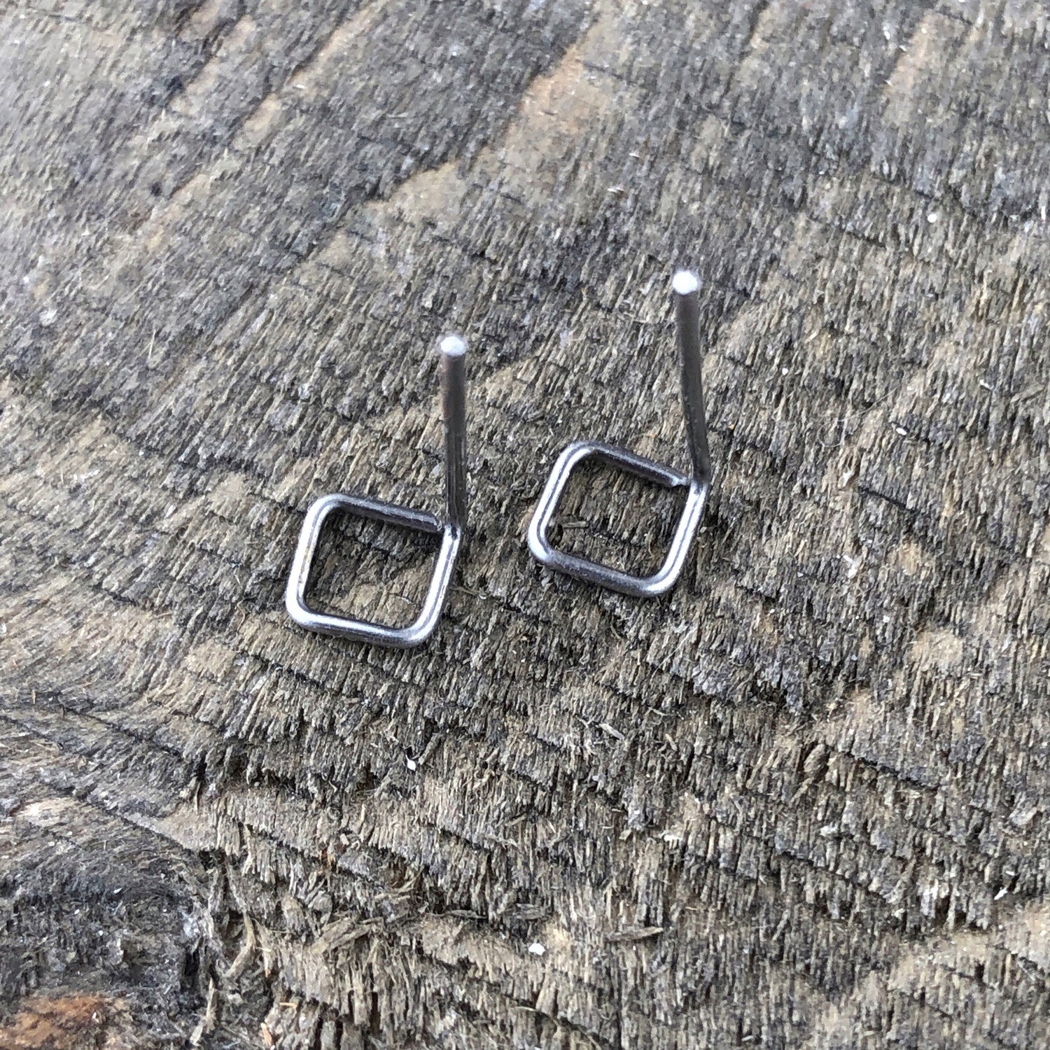 Tiny stainless steel studs. These are handmade, so expect slight variation from piece to piece. Stud ends are filed smooth for comfort. Comes with clear silicone stoppers.