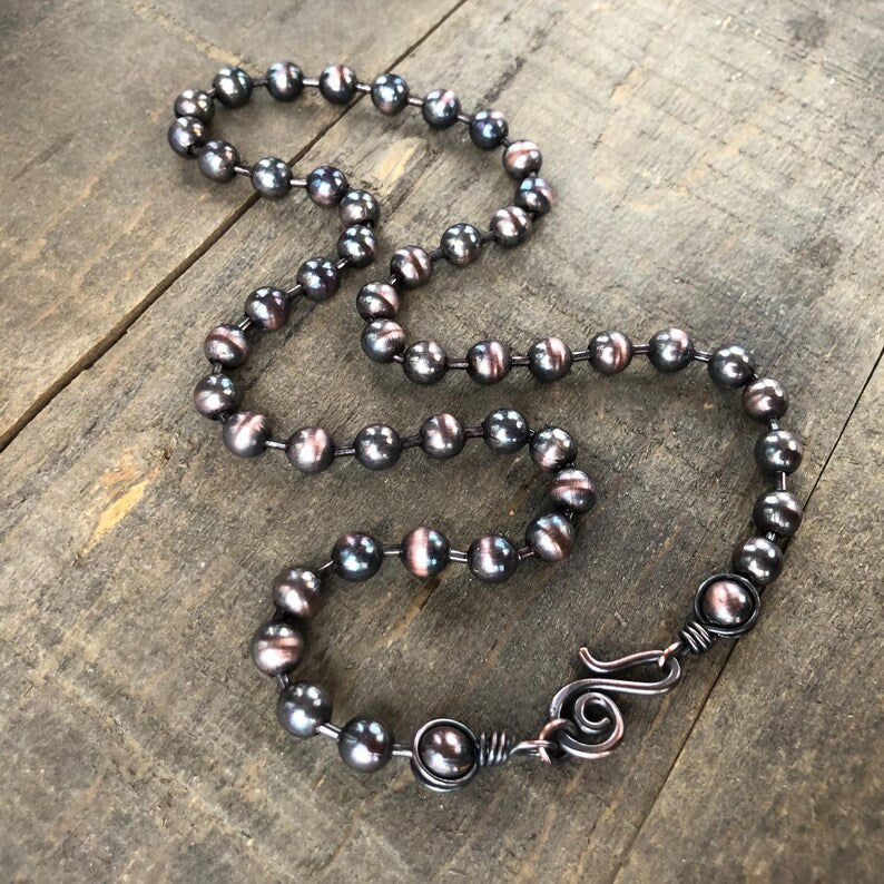 Dark Patina 6mm Copper Ball Chain Necklace – Handmade Artisan Clasp, Custom Length