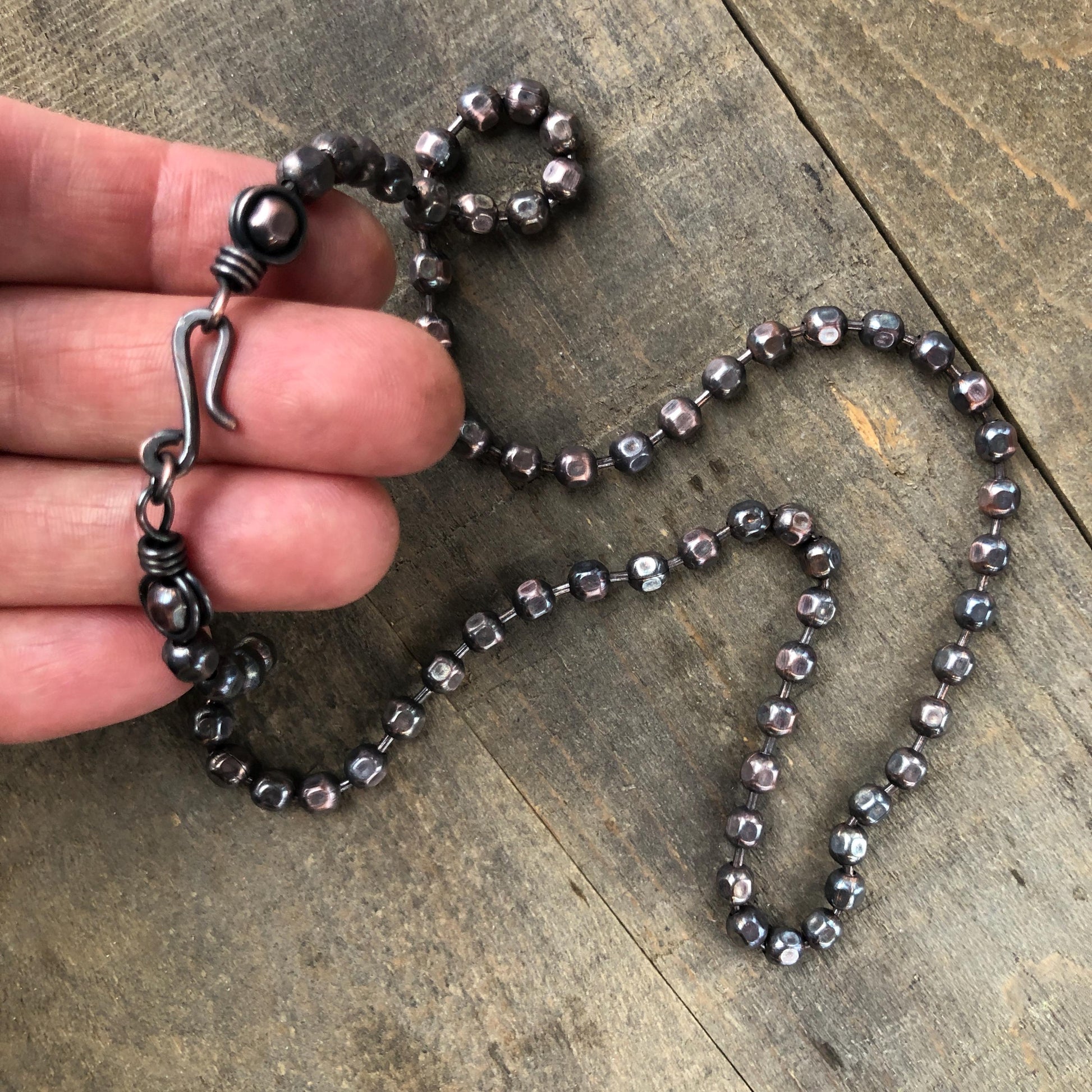 This chunky 6mm faceted copper ball chain necklace features a handmade artisan clasp and subtle flattened facets that enhance both visual depth and tactile feel. Each piece is carefully hand-antiqued for a rich, warm finish, creating a distinctive, rustic appeal.