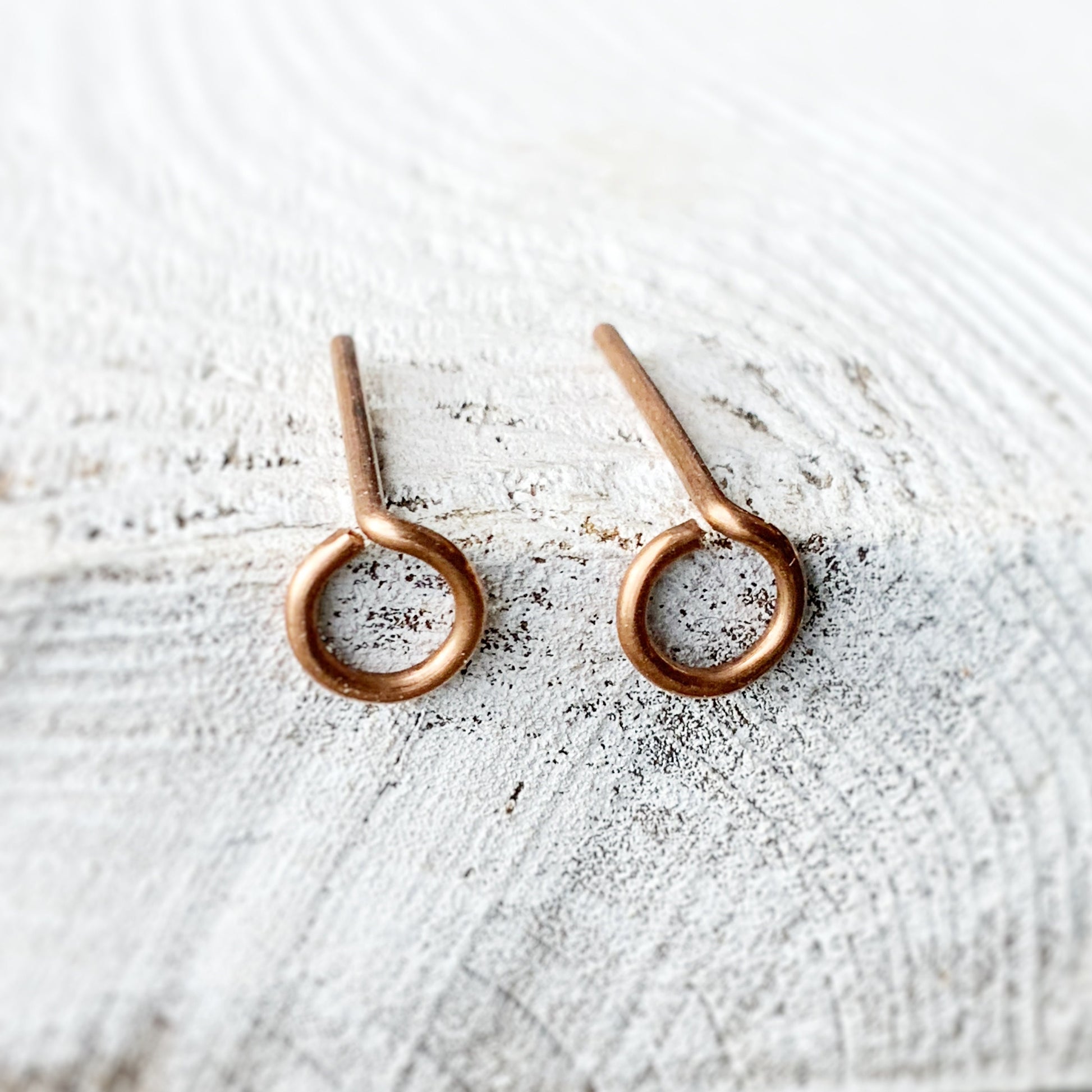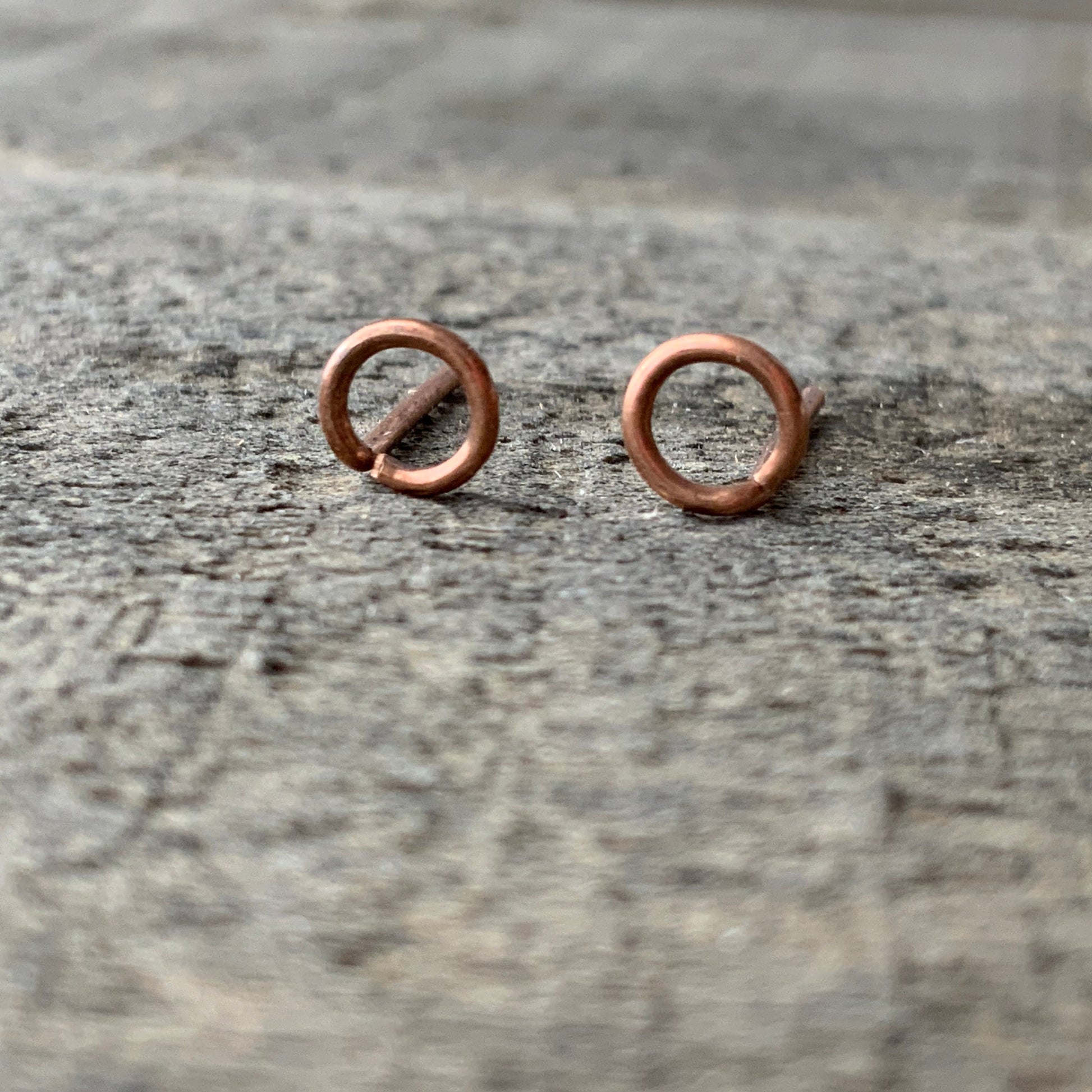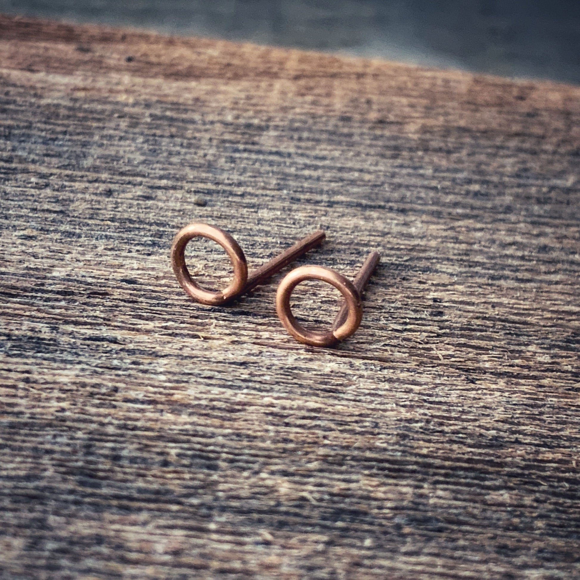 Tiny genuine copper studs. These are handmade, so expect slight variation from piece to piece. Stud ends are filed smooth for comfort. Comes with clear silicone stoppers.