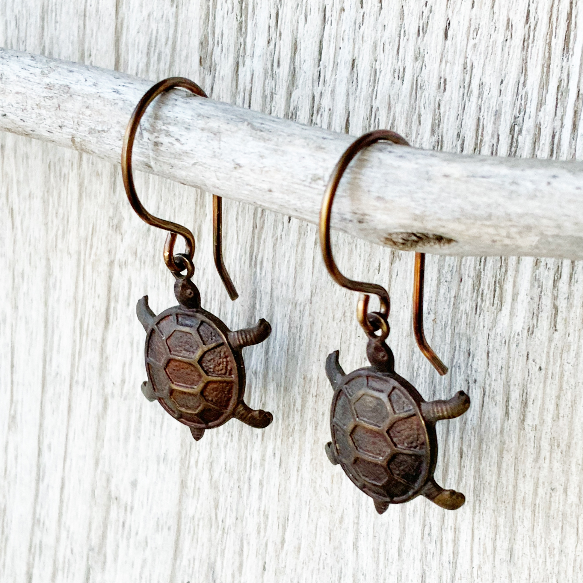 Charming and rustic, these handmade turtle earrings feature hand-patina’d solid brass charms paired with artisan ear wires.