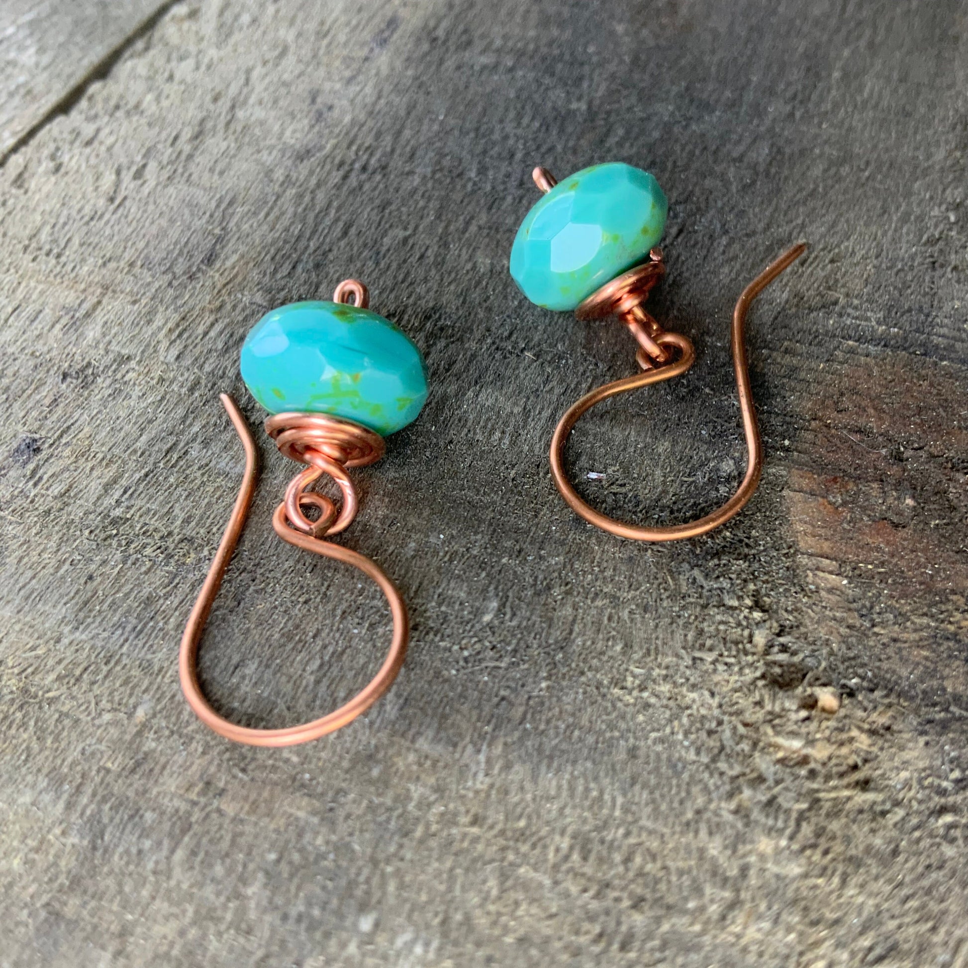 Handmade copper earrings featuring wire-wrapped turquoise Czech glass rondelle beads. Each pair hangs from solid, nickel-free copper ear wires, making them lightweight, comfortable, and perfect for everyday wear.