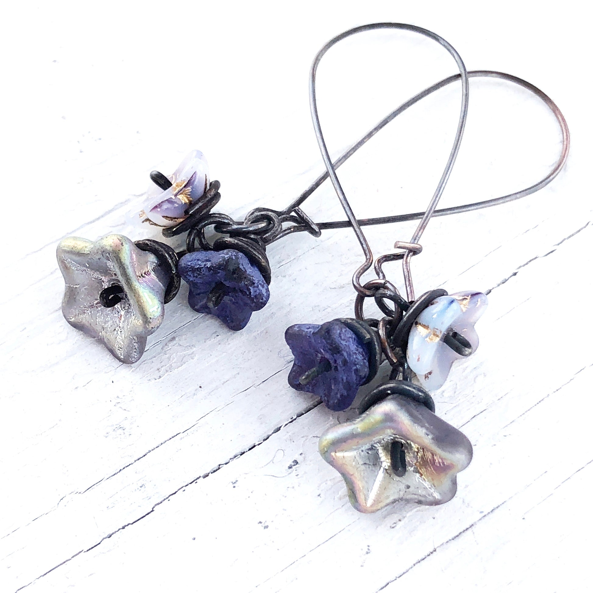 Three little purple Czech glass flowers are wire wrapped and dangle from long kidney ear wires. The metal is solid copper wire (nickel-free) which has been oxidized to darken them.